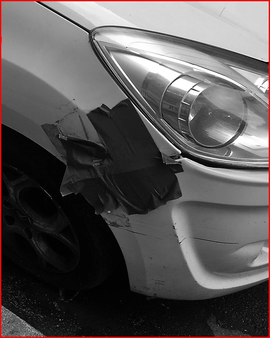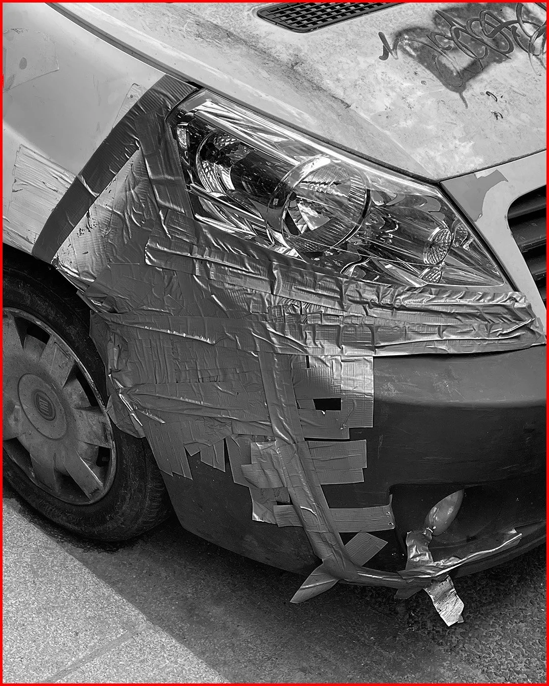 Dans ces images, je me suis arrêté.e pour observer la réponse aux dommages, dans ce cas il s’agit des voitures. Il y a quelque chose de profondément humain dans ces gestes : l'urgence de résoudre, de soutenir, de continuer d'avancer même avec une réparation improvisée.
